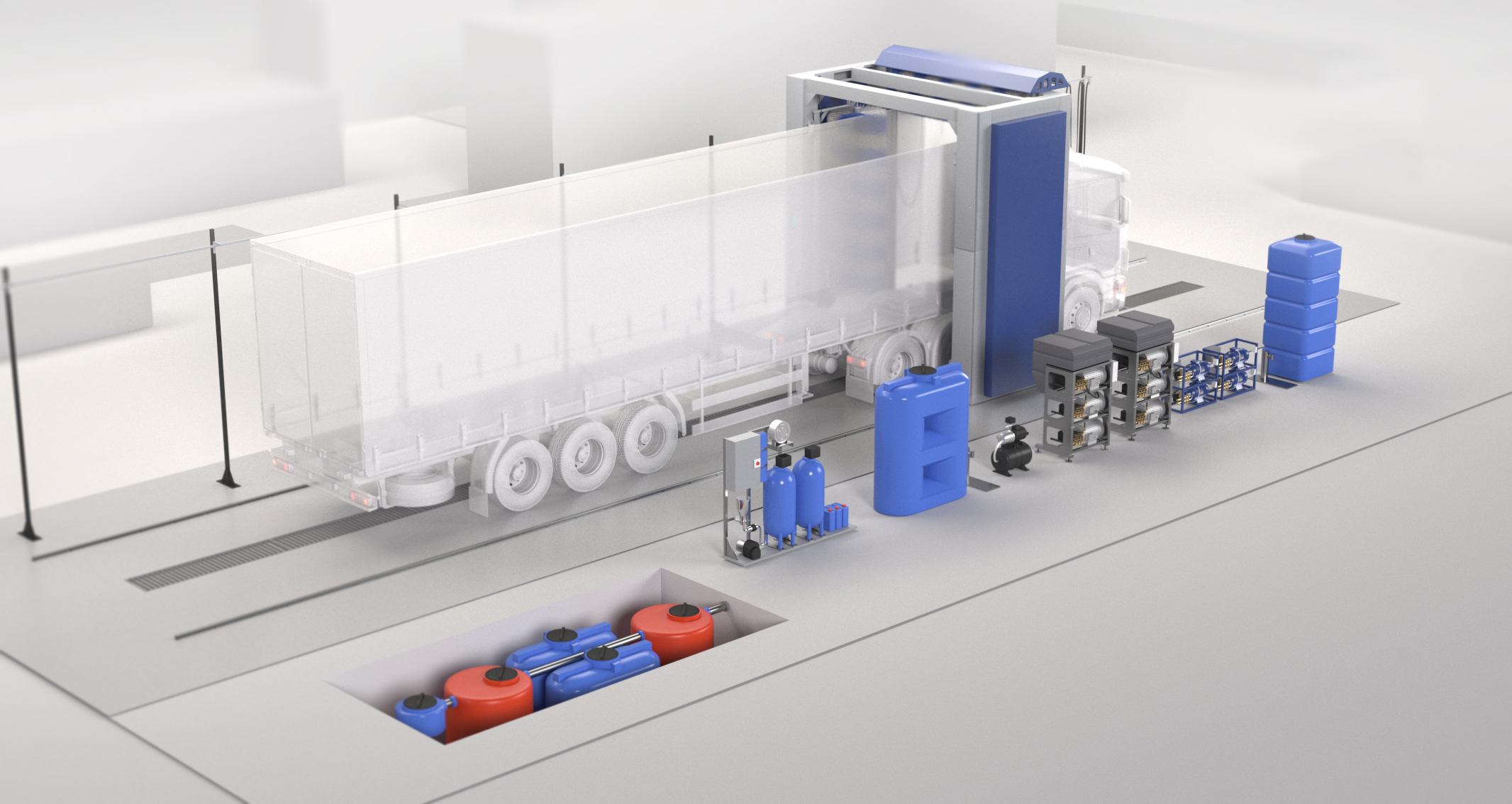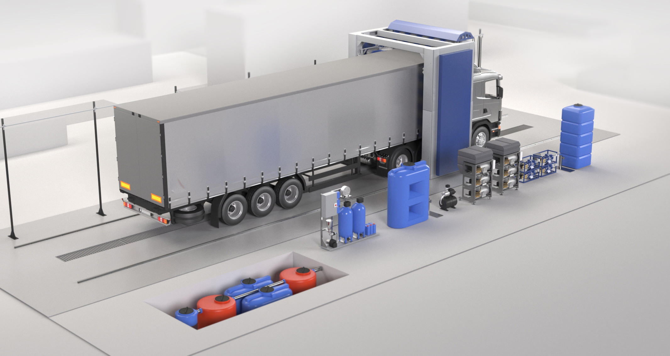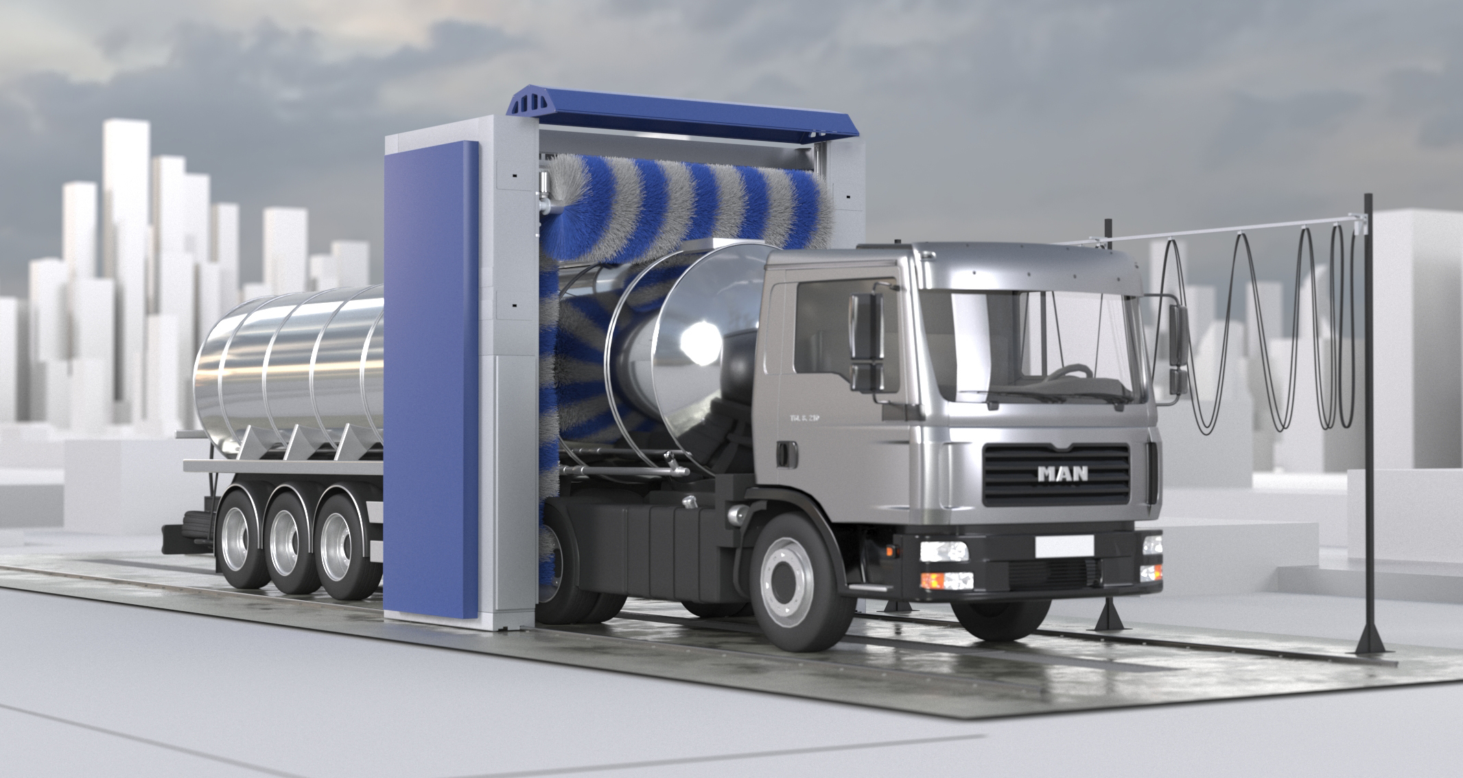 Установка предназначена для внешней мойки грузовых автомобилей, автобусов, строительной и специальной техники.
